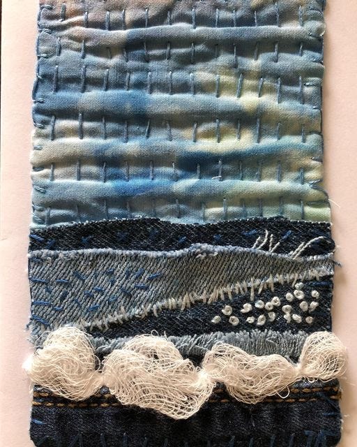 Layers - a small slow-stitch piece I made - scraps of fabric and thread placed one over another until something whole begins to appear.